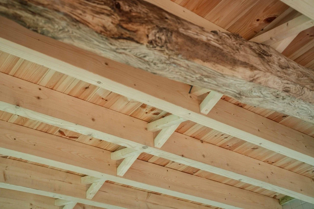 Exposed fire treated joists with herringbone strut and restored orginal beams across groundfloor ceiling
